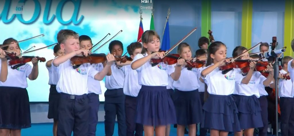 L’Istituto Comprensivo Chieri 3 ha partecipato oggi pomeriggio, lunedì 18 settembre, alla 23^ edizione di ”Tutti a scuola”, la cerimonia di inaugurazione dell’anno scolastico 2023-24. Hanno partecipato all’evento il Presidente della Repubblica Sergio Mattarella e il Ministro dell’Istruzione e del Merito Giuseppe Valditara. L’evento, ospitato dall’istituto tecnico Saffi-Alberti di Forlì, è stato trasmesso in diretta su Rai1 Gli studenti chieresi sono stati selezionati tramite un avviso pubblico a cui hanno partecipato istituti di tutta Italia: 25 violinisti hanno eseguito ‘Carovana nel Deserto”, accompagnati dal loro maestro Simone Zoja. (Le foto sono tratte dalla diretta di RAI1)