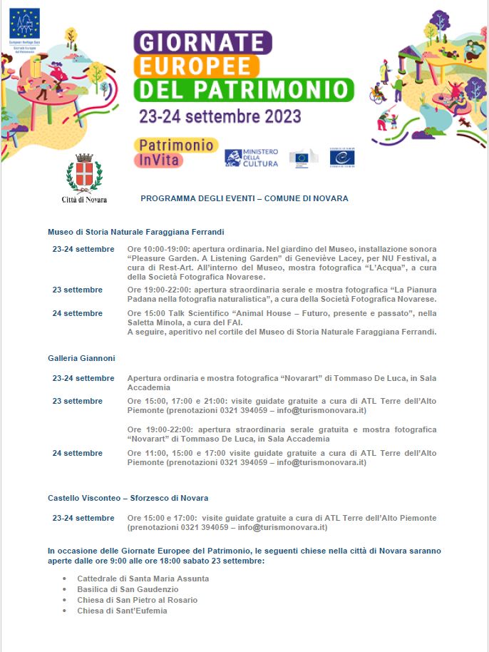 La città di Novara aderisce alle Giornate europee del Patrimonio che si svolgeranno il 23 e 24 settembre. Due giornate di visite guidate, iniziative speciali e aperture straordinarie saranno organizzate nei musei e nei luoghi della cultura italiani sul tema: “Patrimonio InVita”.Sono anche previste aperture straordinarie serali nei musei statali.