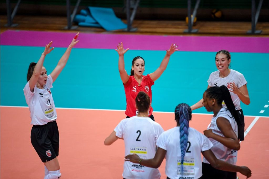 Un’esultanza delle biancorosse nel derby con Mondovì di giovedì 14(credito Danilo Ninotto)