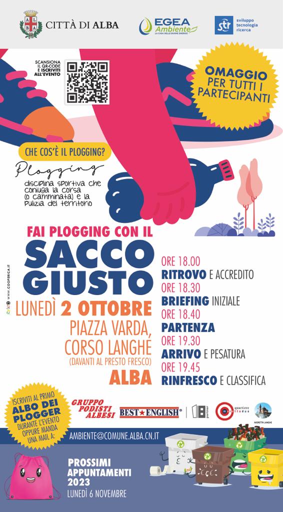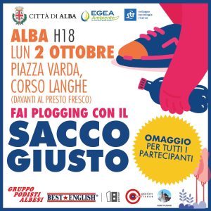 Proseguono gli appuntamenti “Fai plogging con il sacco giusto” organizzati dall’Amministrazione comunale di Alba, in collaborazione con Egea Ambiente, Società di Trattamento Rifiuti Str, in partenariato con Co.A.B.Se.R. Consorzio Albese Braidese Servizi Rifiuti, Interreg Alcotra e Gruppo Podisti Albesi.