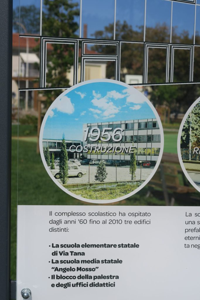 La seconda imprecisione: il cartello dice che l’edificio ospitò la scuola elementare di Via Tana e la scuola media “Angelo Mosso”, oltre alla palestra e agli uffici didattici.  La verità è che inizialmente esso insieme alla scuola media “Angelo Mosso” ospitò l’ “Istituto Einaudi per Ragionieri e Geometri”. Solo qualche anno dopo a quelle due scuole si aggiunse la scuola elementare. Ma per consentire questo, nel 1967  l’edificio venne rialzato di un piano, nel quale si trasferì l’ “Istituto Einaudi per Ragionieri e Geometri” lasciando alla scuola elementare di via Tana le aule del pianterreno.