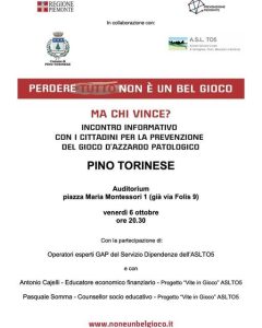 Venerdì 6 ottobre alle ore 20.30 presso l’Auditorium di Piazza Montessori 1 (già via Folis, 9) si terrà l’incontro formativo “Ma chi vince?” con la partecipazione di operatori esperti GAP del Servizio Dipendenze dell’ASL TO5 e con Antonio Cajelli e Pasquale Somma del progetto “Vite in gioco”.