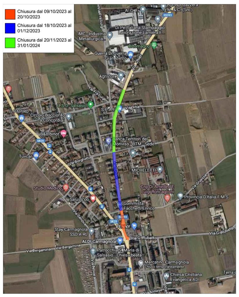 - Istituzione di Senso Unico della Via Fra Luigi nel tratto compreso tra Via Mussetti e la SS.393 – Via Chieri in direzione sud (centro di Carmagnola).