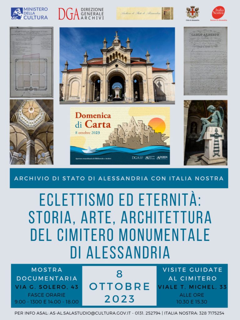 In occasione della “Domenica di Carta”, la giornata che il Ministero della Cultura dedica alla visita delle Biblioteche e degli Archivi dello Stato nel corso della quale bibliotecari ed archivisti saranno lieti di svelare segreti e racconti da documenti che compongono il patrimonio culturale degli Istituti dove si salva la Memoria e si custodisce la Storia, l’Archivio di Stato di Alessandria, in collaborazione con il Comune di Alessandria e la Sezione cittadina di Italia Nostra, propone la mostra documentaria Eclettismo ed Eternità: storia, arte e architettura del cimitero monumentale di Alessandria. Attraverso un’esposizione di documenti tratti dall’archivio comunale, custodito a titolo di deposito nell’Archivio di Stato, saranno presentati storia, progetti ed ampliamenti del cimitero monumentale, vero e proprio “museo a cielo aperto” che costituisce uno dei complessi architettonici più grandiosi e suggestivi della città, nonché un fulgido esempio di eclettismo stilistico.