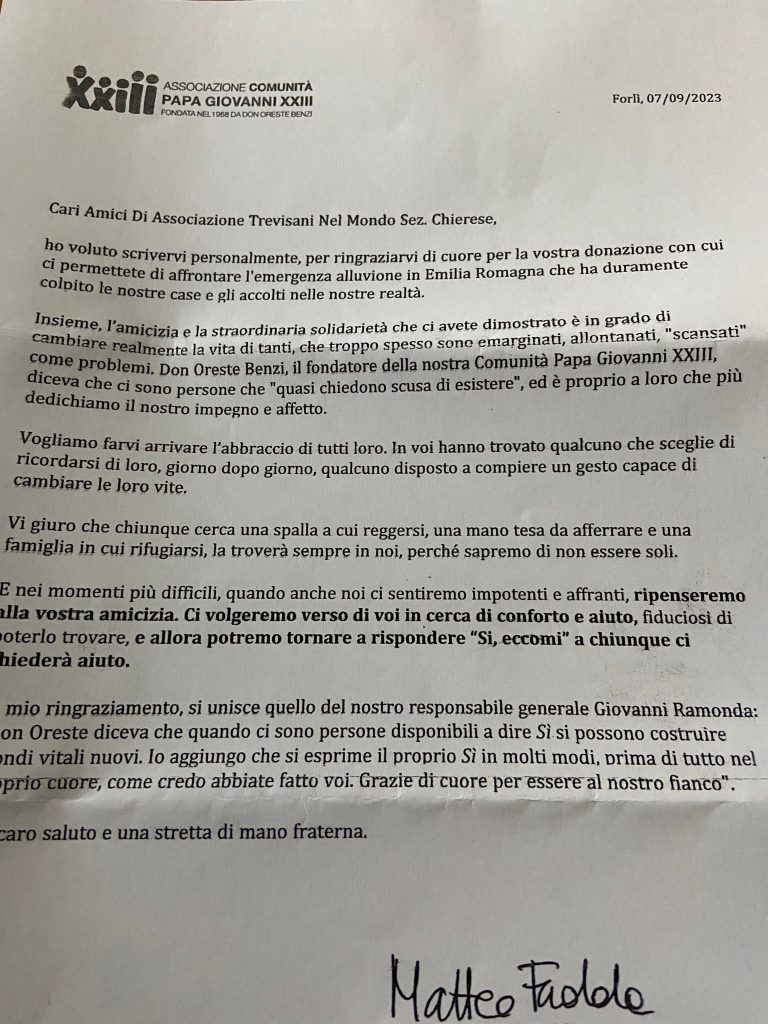 Elio Tarraran, dell’associazione Trevisani nel Mondo, sezione Chierese. ci segnala la lettera che hanno ricevuto dall’Associazione Papa Giovanni XXIII di Forlì a cui hanno mandato una raccolta fondi per l’alluvione.