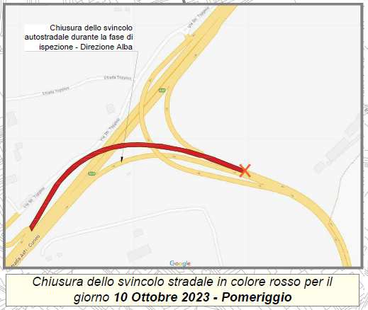 Per ispezioni alle rampe sopraelevate, martedì 10 ottobre dalle ore 9.00 alle ore 13.00 ad Alba è chiuso lo svincolo della tangenziale d’ingresso in città, per i veicoli provenienti da Roddi e diretti in Alba attraverso corso Nebbiolo.