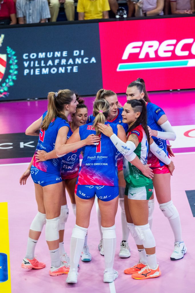 PRIMO SET Bellano schiera Adelusi opposta a Signorile, Haak e Kubik schiacciatrici, Sylves e Hall al centro, Scognamillo libero. Marchiaro risponde con la diagonale Cambi-Storck, D’Odorico-Sorokaite in banda, Akrari-Polder al centro, Moro libero. Dopo un avvio all’inseguimento, la Honda Olivero S.Bernardo Cuneo mette la testa avanti per la prima volta sul 9-10 e trova il break con Hall, autrice di un’ottima partenza: 10-13 e time out per Marchiaro. Ancora Hall e Haak per l’allungo cuneese (11-15). D’Odorico è costretta a lasciare il campo per un infortunio, al suo posto l’ex Ungureanu. Un errore al servizio di Kubik innesca il tentativo di rimonta della Wash4Green Pinerolo, che prende forza con il muro di Polder e l’ace di Ungureanu (14-16). La fast di Sylves e un errore in attacco di Sorokaite riportano le gatte a distanza di sicurezza. Dopo il time out per la panchina di casa sul 14-19 le gatte accelerano ancora con Sylves e Adelusi (15-23). Un errore di Cambi dai nove metri e il punto numero 7 di Hall consegnano il primo parziale alla Honda Olivero S.Bernardo Cuneo: 17-25 (0-1). Tabellino: 7 Hall, 5 Storck, 4 Adelusi