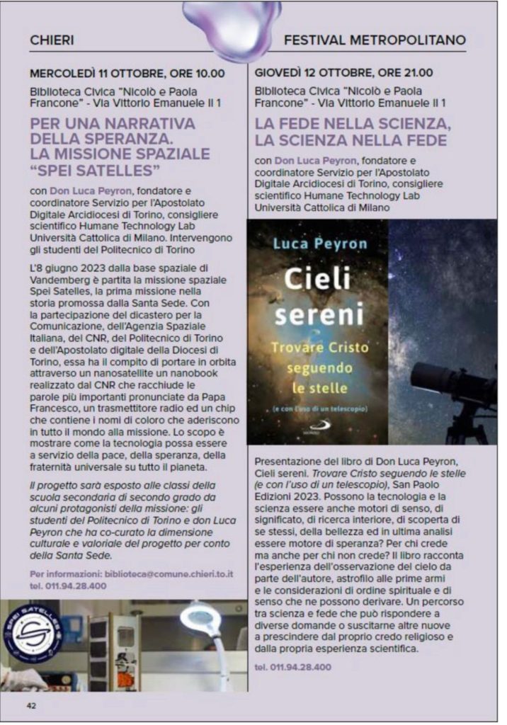 Anche Chieri partecipa al Festival dell’Innovazione e della Scienza: doppio appuntamento in biblioteca domani mattina e giovedì sera con don Luca Peyron, membro dell’Associazione Teologica Italiana per lo Studio della Morale; insegna Teologia dell’Educazione presso IUSTO (Torino), Spiritualità dell’Innovazione presso l’Università degli Studi di Torino, sociologia dell’innovazione presso l’Università Europea di Roma e Teologia presso la Facoltà di Economia dell’Università Cattolica del Sacro Cuore (Milano).