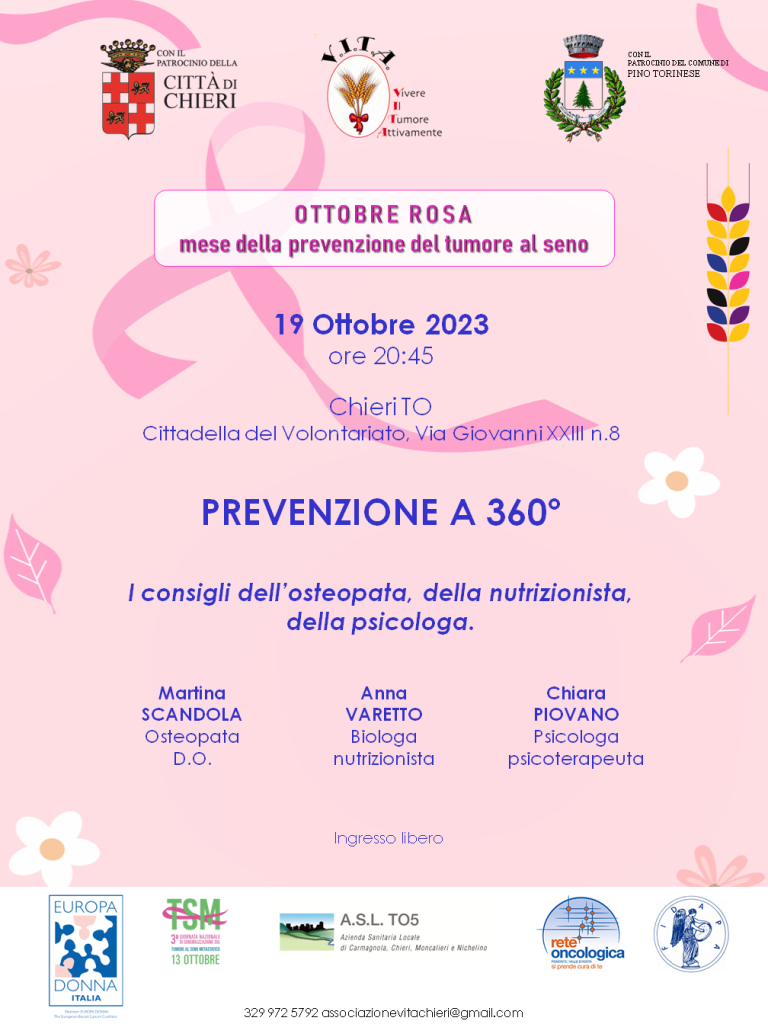 L’Associazione V.I.T.A nell’ambito delle iniziative di Ottobre Rosa, organizza un incontro sul tema degli stili di vita e della prevenzione a 360°.Tre giovani professioniste (Chiara Piovano psicologa e psicoterapeuta, Martina Scandola osteopata D.O., Anna Varetto biologa nutrizionista) forniranno importanti consigli, in particolare al mondo femminile, per mantenersi in salute e promuovere un corretto stile di vita per prendersi cura della propria persona e esercitare una efficace prevenzione.