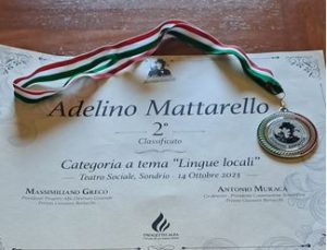 Sabato 14 ottobre, in quel di Sondrio, 2° assoluto nella categoria lingue locali d’Italia, con la poesia in veneto/polesano ME RICORDO CHE (che descrive la vita contadina a cavallo e subito dopo la Seconda guerra mondiale del secolo scorso) in occasione del X Concorso Letterario Internazionale Giovanni Bertacchi. In più, la possibilità di partecipare, all’interno di una cerchia ristretta a 30 persone, il prossimo 10 novembre, ad ulteriore votazione, presso una sala di Palazzo Giustiniani, a Roma, sede del Senato della Repubblica Italiana.