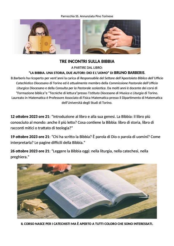 Una bella iniziativa ecclesiale e culturale quella che propone la Parrocchia di Pino con questo Corso di conoscenza della Bibbia tenuto dal professor Bruno Barberis.