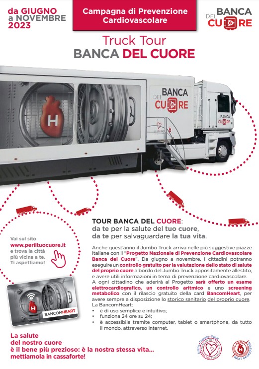Dopo il grande successo delle scorse edizioni, riparte a grande richiesta la straordinaria Campagna Nazionale di Prevenzione Cardiovascolare “Truck Tour Banca del Cuore 2023” facente parte del più ampio Progetto Nazionale di Prevenzione Cardiovascolare “Banca del Cuore”.
