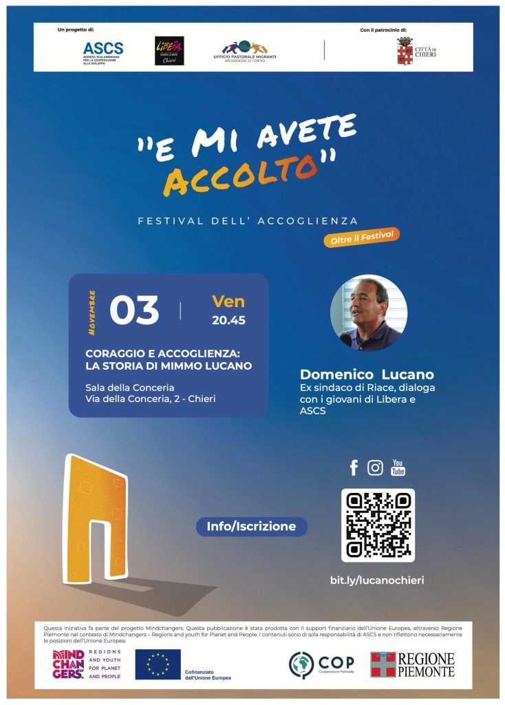 A Chieri, venerdì 3 novembre, per il Festival dell’Accoglienza organizzato da ASCS e Libera, nell’auditorium Rosario Livatino del Liceo Monti in Via Montessori, incontro dal titolo “Coraggio e accoglienza: la storia di Mimmo Lucano”. L’incontro, inizialmente previsto in Sala Conceria, è stato spostato nel più capiente auditorium del Monti. Domenico Lucano, ex sindaco di Riace è stato protagonista di molte pagine di giornali negli ultimi anni: prima la storia del comune spopolato che ritorna in vita grazie all’accoglienza dei richiedenti asilo, poi le accuse e i processi per la gestione delle cooperative di accoglienza, fino ai recenti episodi della vicenda giudiziaria che hanno di fatto scagionato l’ex sindaco calabrese dalla maggior parte delle accuse. Lucano sarà ospite di questo evento “Fuori festival” a Chieri: con lui dialogheranno i giovani del presidio di Libera di Chieri “Rita Atria” e del gruppo chierese dell’ASCS – Agenzia Scalabriniana per la Cooperazione allo Sviluppo