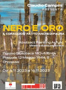 L’artista Claudio Campini espone le sue opere al Mome di Chivasso dal 6 al 16 novembre prossimi in un dualismo cromatico in cui il coraggio ha la luce dell’oro e la paura è la sintesi sottrattiva di tutti i colori dello spettro visibile. Si chiama infatti “Nero e oro. Il coraggio è fatto anche di paura” la mostra di pittura acrilica ospitata dalla biblioteca civica Movimente, promossa dal Comune in collaborazione con Coopculture, che rappresenta il primo percorso artistico creativo di Campini sviluppato su diverse tele, dove si vuole rapportare l’importanza del coraggio, senza la pretesa di essere compresi.