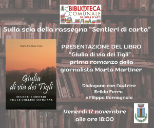 Isola si prepara ad immergersi in un’atmosfera avvolta da segreti e misteri, quando l’associazione Costigliole Cultura presenta venerdì 17 novembre alle 18 il romanzo giallo d’esordio di Marta Martiner Testa. Si torna a raccontare “Giulia di via dei Tigli” tra le magiche e colorate pareti di scaffali zeppi di libri di una biblioteca. A dialogare con l’autrice ci saranno due esperti del territorio: il professor Erildo Ferro e il professor Filippo Romagnolo, presidente di Costigliole Cultura. Porterà il suo saluto anche il sindaco Michael Vitello e a fare gli onori di casa Chiara Cirio, presidente della biblioteca. Il romanzo si immerge nel mondo di Giulia, una figura avvolta da un’enigmatica aura di mistero. La sua scomparsa getta un’ombra sulla quiete apparente della vita di paese, dando il via a una serie di delitti che scuotono la comunità. Insieme all’autrice, si parlerà di misteri, intrighi, passioni, emozioni, ma anche di territorio, paesaggio e tradizioni locali. Sarà l’occasione per approfondire le motivazioni che hanno spinto l’autrice a esplorare questo affascinante intreccio di segreti e intrighi nelle terre astigiane. Chi è Giulia? E dove è finita? Il mistero si infittisce quando una serie di delitti sconvolge l’apparente tranquilla vita di paese, in cui tutti si conoscono. Dall’esterno si ha spesso l’idea che nei paesi si sappia tutto di tutti, i pettegolezzi abbondino e non ci siano segreti. In realtà non è così. La stessa cronaca nera locale offre innumerevoli prove di quanto poco si sappia di persone che conosciamo da sempre e che abitano di fianco a noi. In un piccolo paese dell’astigiano, Domenico si è appena trasferito nella sua nuova casa, un vecchio cascinale in cui riprendere il filo della sua esistenza. Da un vecchio baule in soffitta saltano fuori, però, misteriose lettere che risalgono ad almeno vent’anni prima e indirizzate ad una giovane donna. Ma in paese nessuno sembra ricordare quella ragazza e le domande di Domenico fanno riemergere vecchi segreti nascosti nelle nebbie del tempo, come quelle nebbie che avvolgono vigneti e borghi della campagna astigiana in autunno. Amore, amicizia, speranza e timori sono gli elementi centrali di questa narrazione avvincente, che si svolge sullo sfondo delle affascinanti colline dell’astigiano. Finché il mistero non è risolto e le nebbie si alzano per tornare a dar luce alla vita. Il ritmo è incalzante e non risparmia nessuna delle persone che sono coinvolte in quello che, pagina dopo pagina, si trasforma in un giallo molto coinvolgente. Marta è originaria di Costigliole, ma con radici nel Biellese. Laureata in Scienze Politiche a Torino, è giornalista dal 2002 per La Nuova Provincia: si è occupata per dieci anni di cronaca nera e oggi si dedica all’attualità. Questo è il suo primo romanzo, che dà alle stampe dopo averlo tenuto a lungo nel cassetto, mantenendo intatta la sua capacità di coinvolgere il lettore. L’autrice decide finalmente di condividerlo con il pubblico, svelando le pagine che raccontano una storia avvincente e coinvolgente che intreccia in un’opera di fantasia, eventi presenti e passati ambientati in un paese del Monferrato. Realtà che l’autrice conosce molto bene per ragioni di lavoro e di partecipazione alla vita di paese. Preparatevi ad essere trasportati tra le pagine di un romanzo che promette di svelare i segreti più oscuri celati tra le colline astigiane.