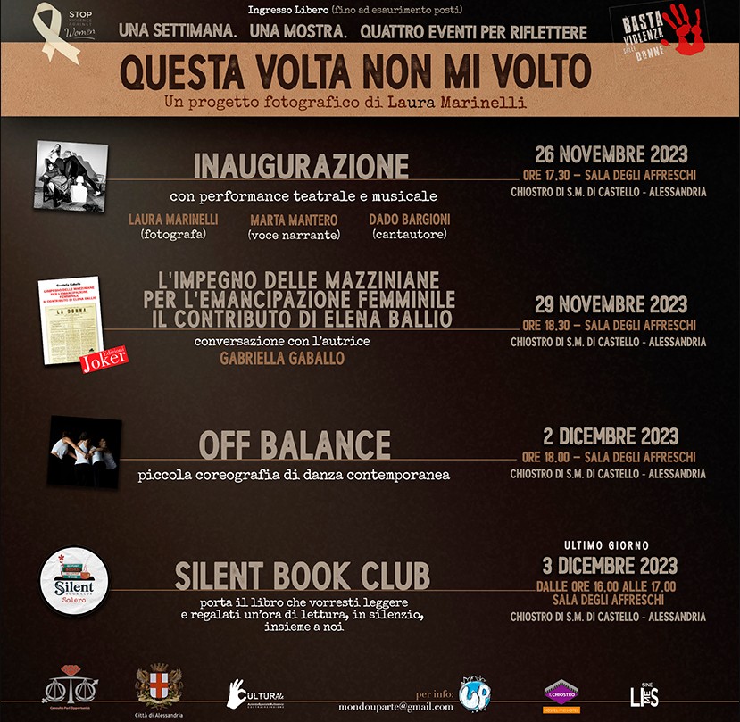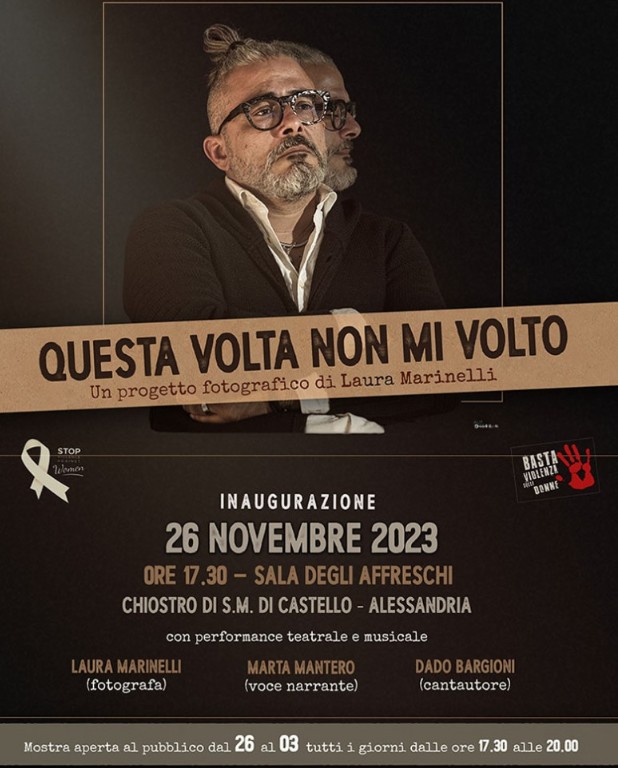 Ad Alessandria Sala degli Affreschi del Chiostro di S.M. di Castello, dal 26 novembre al 3 dicembre “Questa volta non mi volto” progetto fotografico di Laura Marinelli corredato da alcuni eventi nelle giornate dedicate all’eliminazione della violenza contro le donne