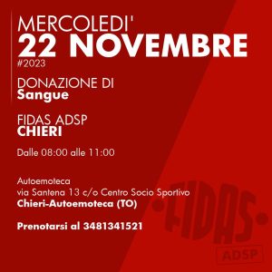 “Donare il sangue è un gesto di vicinanza a chi ha più bisogno” commenta Gian Pietro Toaldo, Presidente della FIDAS di Chieri. Dopo aver eguagliato i prelievi dello scorso anno già nel mese di ottobre, grazie anche all’iniziativa di sensibilizzazione avviata nelle scuole di Chieri, la Fidas si accinge a chiudere l’anno con almeno 100 donazioni in più. La crescente richiesta ha spinto a organizzare una nuova giornata di prelievi straordinari che si terrà a Chieri martedì 22 novembre. Chi vorrà donare il proprio sangue, troverà l’Autoemoteca della FIDAS nello spazio esterno del Centro Socio Sportivo di Via Santena 13 dalle ore 8 e alle 11. Vi sarà disponibilità per circa 30 donatori; chi desidera dovrà prenotarsi al numero 348.1341521. Sarà anche un momento propizio per sensibilizzare i chieresi alla donazione del sangue e acquisire le informazioni indispensabili per le future donazioni.