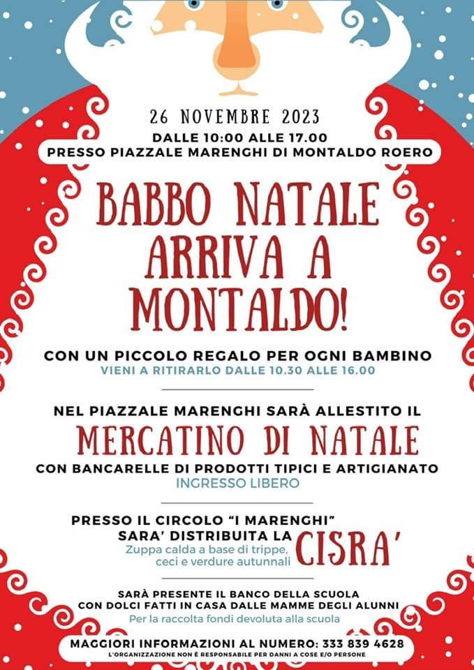 Domenica 26 novembre BABBO NATALE arriva a MONTALDO ROERO dalle ore 10,00 alle ore 17,00 in Piazzale Marenghi dove sarà allestito il Mercatino con bancarelle di prodotti tipici . Presso il Circolo dei MARENGHI sarà distribuita la CISRA’ (zuppa calda a base di trippa, ceci e verdure autunnali. Ecco il programma della manifestazione.