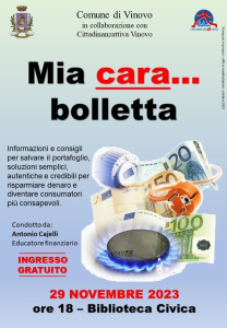Cittadinanzattiva di Vinovo ha organizzato con il Comune di Vinovo un incontro dedicato al “Caro Bollette”. Antonio Cajelli, educatore finanziario, darà informazioni e consigli per risparmiare denaro e diventare consumatori più consapevoli. Carlo Ciancarelli, Attivatore Civico di Cittadinanzattiva, parlerà di sostenibilità energetica e presenterà un questionario dedicato alle Energie di Comunità. In questo momento di cambiamenti (termine del mercato tutelato e passaggio al mercato libero) è utile avere informazioni certe e non di parte. L’incontro, ad ingresso gratuito, si svolgerà il 29 novembre alle ore 18 in Biblioteca Comunale (all’interno del Castello della Rovere). Siete tutti invitati a partecipare. Portate con Voi una bolletta, per capire come leggerla.