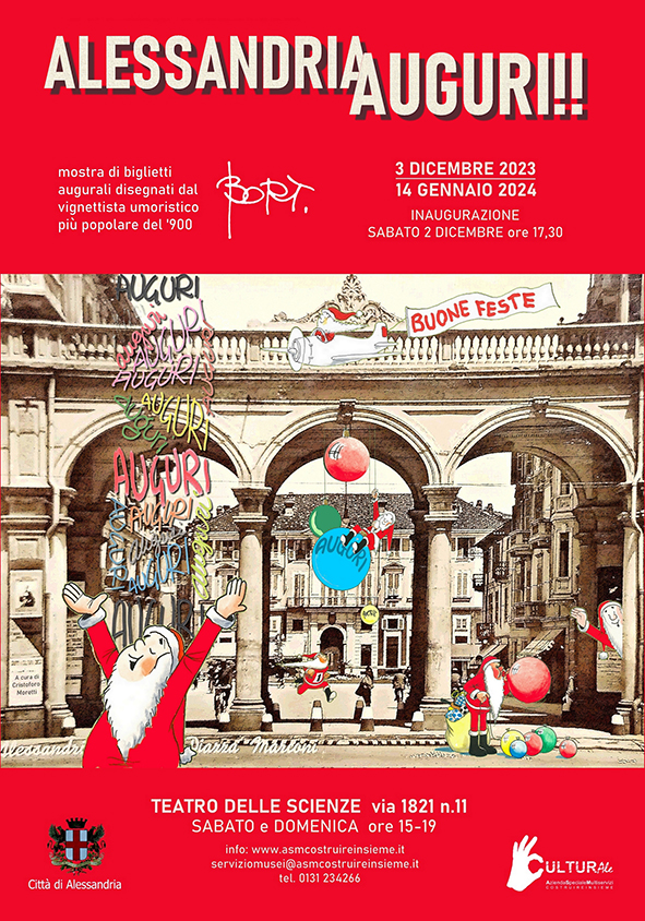 Sabato 2 dicembre alle ore 17.30 al Teatro delle Scienze di Via 1821, n. 11 ad Alessandria, sarà inaugurata Auguri Alessandria!! mostra di biglietti augurali disegnati da Mario Bortolato in arte BORT il vignettista umoristico più popolare del ‘900, alessandrino di adozione.
