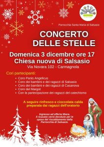 Domenica 3 dicembre alle 17 nella chiesa nuova di Salsasio, in via Novara 102, si terrà un gran concerto con la partecipazione del Coro Panis Angelicus, del coro dei bambini e dei ragazzi di Salsasio e da quello dei bambini e dei ragazzi di Casanova, dal coro del Margot, con la partecipazione dei ragazzi del catechismo.