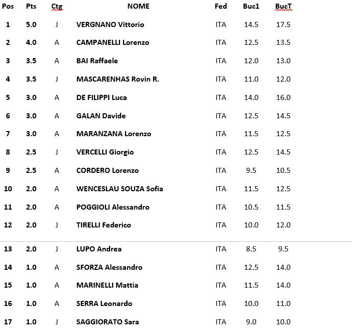 NdR: Buc1 e BucT sono criteri (somma dei punteggi dell’avversario, integrale od escluso il più basso) per stabilire i piazzamenti in caso di parità.