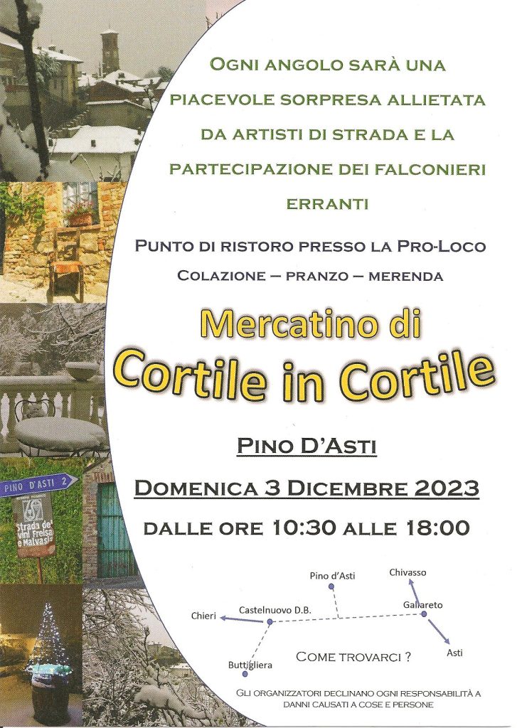 A Pino D’Asti si svolgerà domenica 2 dicembre il Mercatino di Cortile in Cortile dalle ore 10,30 alle ore 18,00.