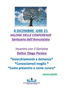 Lunedì 4 dicembre alle ore 21 il dottor Diego Persico, geriatra della nostra AslTo5 tratterà il tema: Invecchiamento e demenze, conosciamoli meglio. Quali le loro caratteristiche e cosa si può fare per prevenirli e curarne le conseguenze.