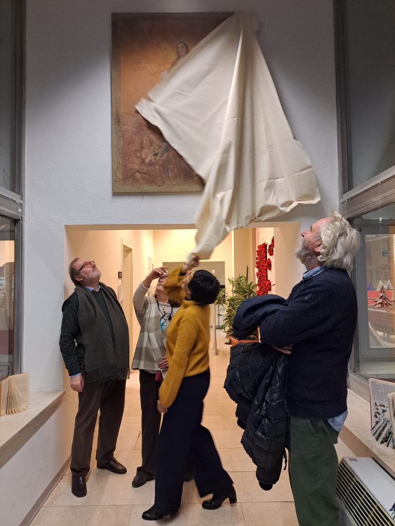 Presentato a Chieri il restauro dell’affresco del secondo Ottocento raffigurante la Madonna Immacolata, staccato dal muro di un edificio che sarà presto abbattuto nell’isolato dell’ex Tabasso e restaurato da Michelangelo Varetto e dai suoi collaboratori del Consotrzio San Luca. Ora, il dipinto, il cui recupero è stato particolarmente complesso, fa bella mostra di sè al primo piano della Biblioteca Civica chierese. Nelle foto: il dipinto restaurato e momenti della presentazione.
