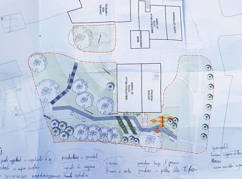 Quindi, intorno alle prime planimetrie del parco, hanno iniziato a svolgersi incontri con i partner e altri attori, quali ad es: giovani di Fridays for Future, esperti di botanica e testimonial della Consulta Chierese per le politiche a favore delle persone con disabilità, ecc, iniziando sopralluoghi sull’area. Prime mosse per un intervento prossimo venturo che si è andato delineando rapidamente, secondo i principi che lo avevano ispirato.