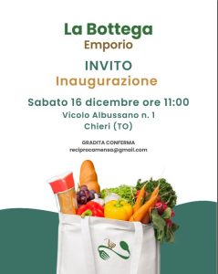“Inaugurazione dell’Emporio “La Bottega”, sabato 16 dicembre alle ore 11.00 in Vicolo Albussano 1, Chieri. Questo servizio di solidarietà, attivo da un anno, cerca di fornire un aiuto alimentare a 285 nuclei famigliari, per un totale di 641 persone. La Bottega, sostenuta solo ed unicamente dall’attività di volontari, viene rifornita con prodotti recuperati dalle eccedenze alimentari provenienti dal Banco alimentare, da Amazon, dal CAAT (Centro Agro Alimentare Torino), dai produttori locali, dai supermercati, dai bar, dalle tavole calde della zona, dalla Scuola americana, da donatori occasionali e dall’invenduto dei mercati cittadini. Tutti gli altri prodotti, che non si recuperano attraverso il contrasto allo spreco, vengono acquistati a prezzi calmierati grazie ai contributi erogati dal Comune di Chieri. L’emporio solidale “La Bottega” è ubicato in un grande magazzino donato dalle eredi del signor Giuseppe Berruto, che saranno presenti all’inaugurazione e nei confronti delle quali si esprime la più profonda gratitudine.” Così la presidente di ReciprocaMensa, Susanna Senacheribbe