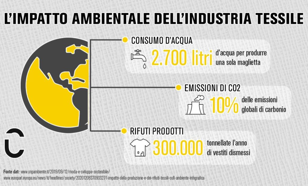 L’Associazione Ambientale del Lavoro, in un doc. del 2023 riporta che la filiera tessile genera il 20% dell’inquinamento di acqua potabile, dovuta a processi di tintura, finitura e lavaggio di capi sintetici. Imprecisi i milioni di tonnellate di microfibre disperse nei mari. Dunque, tale manifattura è un settore ritenuto tra i più inquinanti del mercato globale.
