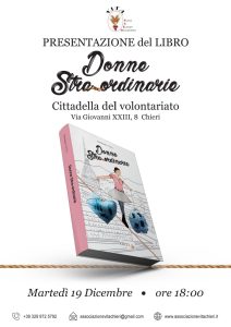 “Donne Stra-Ordinarie” non è solo un libro o l’ultima fatica letteraria che vogliamo presentarvi e possibilmente consigliare la lettura; è un coro di voci, spesso silenziose a volte soffocate, in cui le parole sconfiggono la realtà della vita di ogni giorno. Il laboratorio di scrittura dell’Associazione V.I.T.A., sin dal 2019, permette di tradurre in parole i fatti della vita e consente di esprimere i pensieri che si vogliono trasmettere. Per le sedici scrittrici la parola è diventata scrittura esperienziale, per dare voce, sfogo, testimonianza a frammenti di vita. E’ stata una sorta di terapia, anche per la varietà dei temi e dei modi espressivi, fuori da regole troppo strette, con un procedere vario e un po’ magmatico come talora è il mondo femminile. Un viaggio di storie raccontato da Andreina Rocco, Elena Ferrero, Gabriella Umidon, Graziella Brunato, Laura Luison, Mariangela Carpinello, Nunzia Minutella, Roberta Sottil, Silvia Martini, Simona Chiara, Simonetta Razzetti, Sonia Toffanello, Teresa De Renzis, Tiziana Giubilato, Valeria Martano e Valeria Stola. Completa il libro il contribuito di Silvana Greco e Caterina Praticò, volontarie di associazione V.I.T.A., nonché un passo di Jana Mesautsova, neo dottoressa della facoltà di Scienze Infermieristiche dell’ospedale San Luigi di Orbassano, che ha studiato scientificamente il laboratorio di scrittura terapeutica dell’associazione V.I.T.A.   Il libro sarà presentato in prima assoluta nelle serate di lunedì 18 e martedì 19 dicembre in due serate evento.   Lunedì 18 dicembre alle ore 20,45 alla Biblioteca Civica di Cambiano in Via Lagrange 1.   Martedì 19 dicembre alle ore 18 alla Cittadella del Volontariato di Chieri in Via Giovanni XXIII 8.   Per informazioni potete contattare il n. 329 972 5792 oppure scrivere alla mail associazionevitachieri@gmail.com