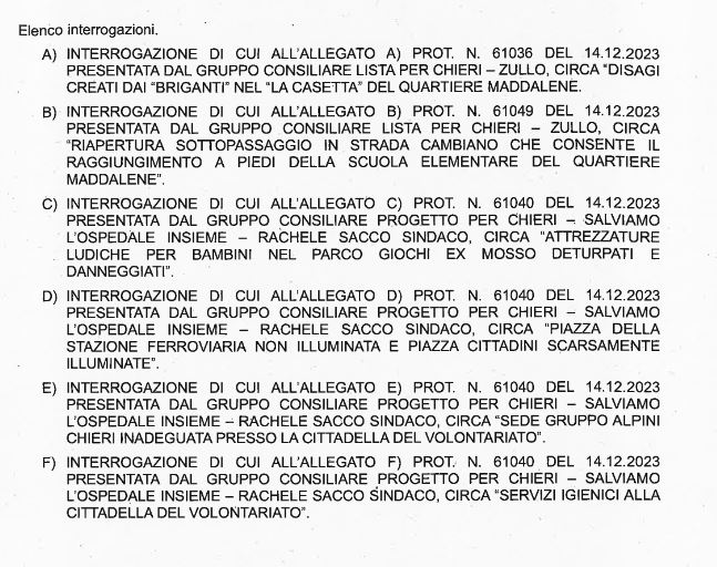 Chieri. Consiglio comunale convocato per giovedì 21 e venerdì 22 dicembre. Ecco l’ordine del giorno