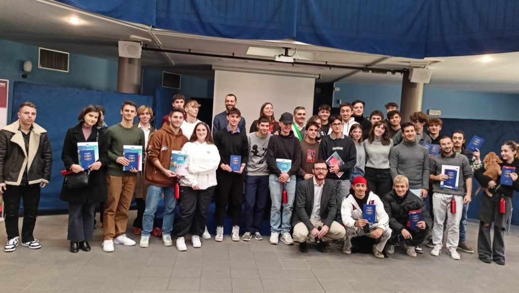 Anche quest’anno, il Comune di Chieri ha fatto omaggio ai ragazzi e alle ragazze chieresi del 2005 di una copia della Costituzione, per festeggiare il loro ingresso nel mondo degli adulti. La cerimonia in Via Conceria, sabato. Nella foto, il gruppo dei 18enni con mil sindaco di Chieri, Alessandro Sicchiero
