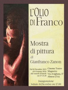 Dopo il grande successo di critica e di pubblico della 3 ° edizione di “Morpho, farfalla rossa” l’Associazione Culturale Cumalè, con il patrocinio del Comune di Almese, è aperta da sabato 16 dicembre nel foier del  Cinema Teatro Magnetto la mostra di pittura “L’OLIO di Franco” di Gianfranco Zanon.
