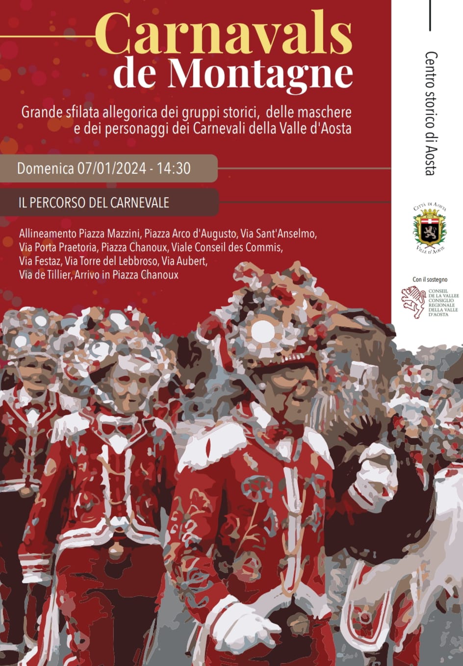 AOSTA domenica 7 gennaio 2024 Grande sfilata dei Gruppi Storici, delle maschere e dei personaggi dei carnevali della VALLE d’AOSTA .
