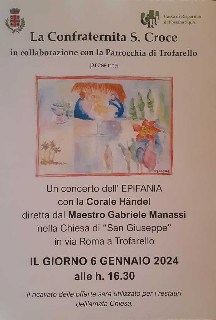 TROFARELLO. Concerto dell’Epifania organizzato dalla Confraternita di Santa Croce in collaborazione con la parrocchia di Trofarello, con la corale “HANDEL ” diretta dal Maestro Gabriele Manassi.