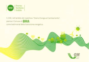 Anche il Comune di Bra è stato premiato con l’attestato di “Testimonial della transizione energetica” assieme ai comuni di Saluzzo, Caraglio, Gorzegno e Fossano nell’ambito dei conferimenti, per la provincia di Cuneo, del Premio “VIVI – Territori Sostenibili” del GSE Gestore Servizi Energetici , dedicato ai comuni virtuosi che si sono concentrati nell’implementazione di interventi di riqualificazione energetica del patrimonio pubblico.