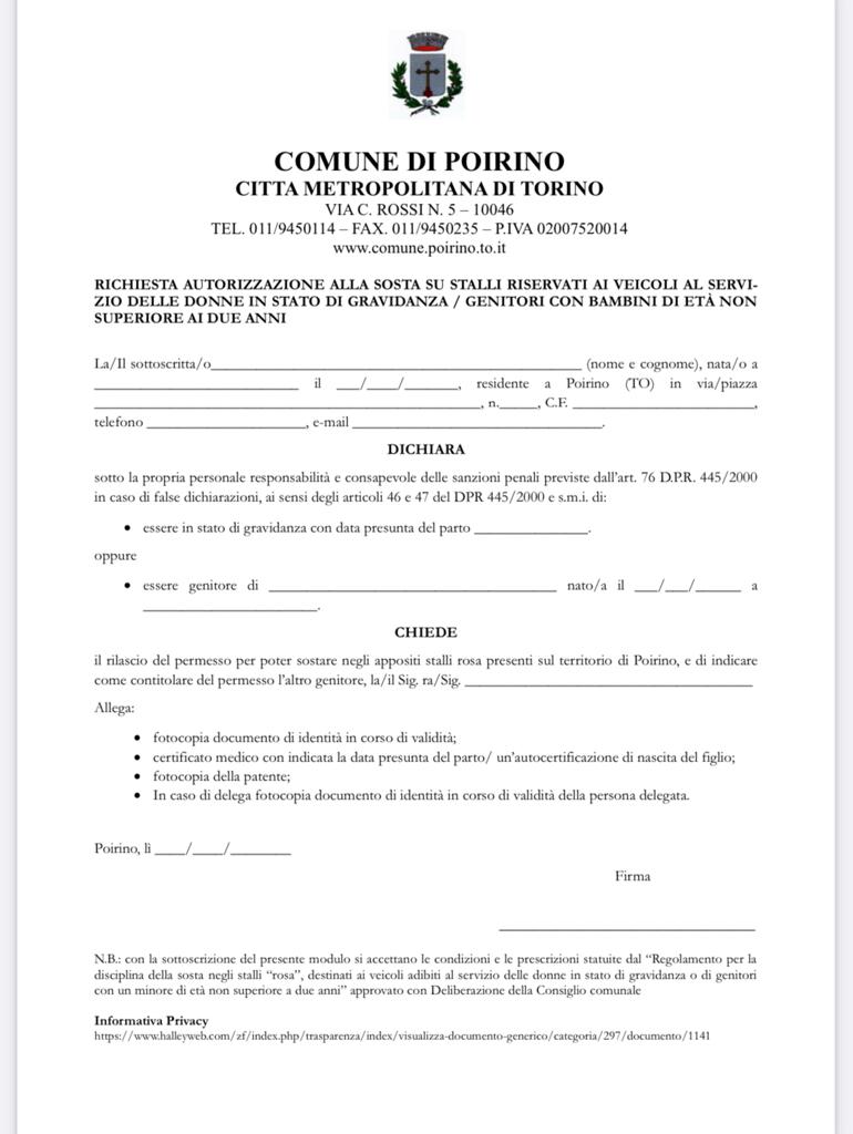L’Amministrazione Comunale di Poirino con deliberazione del Consiglio Comunale n. 33 del 27/07/2023 ha approvato la disciplina della sosta degli “STALLI “ROSA” destinati alla sosta dei veicoli adibiti al servizio delle donne in stato di gravidanza o di genitori con un minore di età non superiore a due anni. I cosiddetti “parcheggi rosa” costituiscono un notevole apporto di natura sociale a sostegno della maternità e della genitorialità, offrendo un’agevolazione pratica in un frangente comune e quotidiano quale la ricerca di un parcheggio, massimamente in prossimità di strutture o servizi ove risulti di norma difficoltosa.