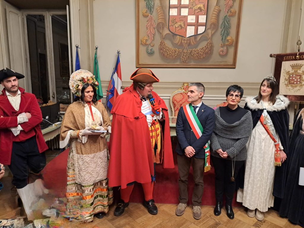 Il Carnevale a Chieri è cominciato venerdì sera con la investitura della Bela Tessioira e del Mangiagrop nella sala del consiglio comunale, presenti Giandoja e Giacometta della Famija Turineisa. Al solito folta la presenza dei personaggi di carnevale provenienti da centri piccoli e grandi della provincia piemontese, che hanno reso omaggio a Nicole Sharon Bonventre e Carlo Carpignano, confermati anche quest’anno nei panni di Tessioira e Mangiagrop. La serata è poi proseguita in Sala Conceria con la musica di Sonia De Castelli e i brindisi finali.