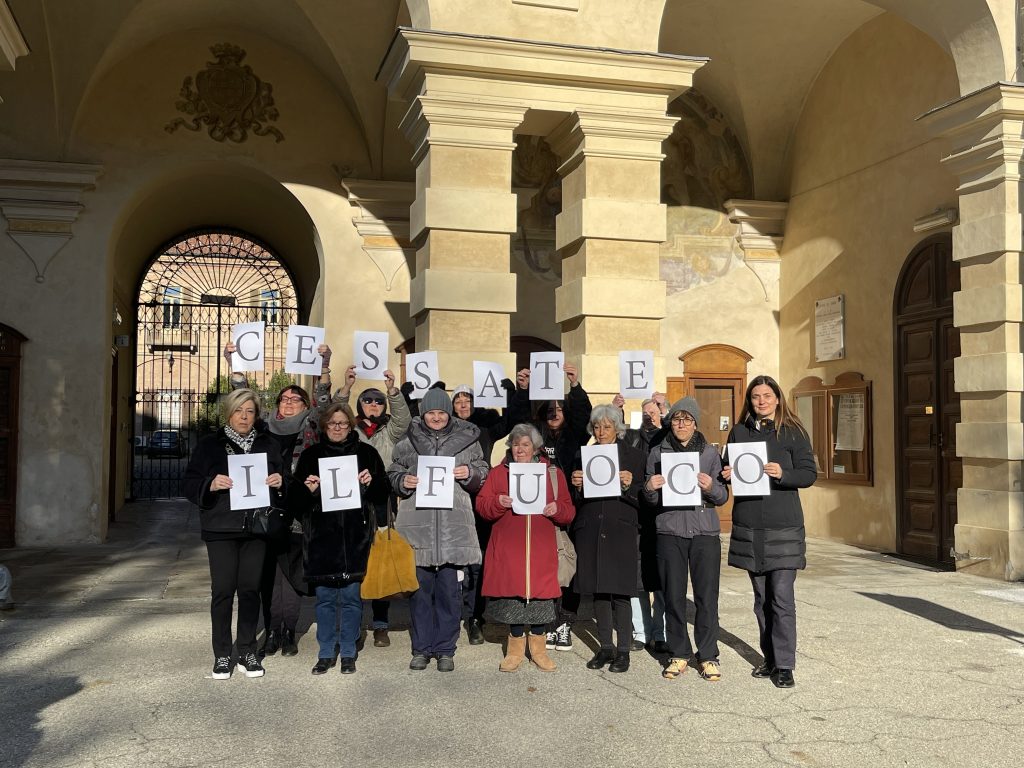 Sabato mattina alle 10 davanti al comune di Chieri, ha avuto luogo il flash mob “cessate il fuoco”.Questa proposta di flash-mob è stata inviata alle cittadine di ogni comune d’Italia. Scritto sui corpi di quattordici donne VESTITE DI NERO a lutto, si è letta la scritta CESSATE IL FUOCO.Sono tutte “Donne in cammino per la pace” e tutte insieme vogliono «raccogliere il testimone delle ‘Donne del sole’ palestinesi e delle ‘Donne che osano la pace’ di Israele, unite per la pace».La modalità della disseminazione della pace scelta dalle organizzatrici è quella del cammino e non quella della “marcia”, termine con una connotazione semantica militaresca: “Il cammino è un atto simbolico, cammino in silenzio per urlare che pace non è utopia; cammino perché ogni passo ci conduca alla pace; cammino per denunciare le atrocità provocate dai conflitti; cammino perché le donne nei conflitti armati sono le prime vittime di violenza e stupro; cammino perché vorrei vederei figli e le figlie fiorire e vivere; cammino in solidarietà alle tante donne che nel mondo agiscono per la loro libertà”.