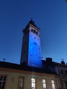 La città di Cuneo ha accolto l’invito dell’ANVCG e dell’ANCI ad attirare l’attenzione sul dramma che vivono le popolazioni dei paesi in guerra con la Torre Civica illuminata di blu per dire “Stop alle bombe sui civili”