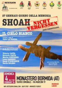 Per questo è nata una “rete” di Enti, Associazioni e Scuole che lavorano insieme alla realizzazione di una serie di eventi. Un primo appuntamento sarà DOMENICA 4 FEBBRAIO ALLE ORE 17 PRESSO IL TEATRO COMUNALE DI MONASTERO BORMIDA con una riflessione sulle tematiche della Shoah seguita dalla rappresentazione teatrale “IL CIELO BIANCO” a cura di Paolo La Farina e degli allievi del corso di recitazione di Cortemilia: letture di brani sulla Shoah, musiche, scenografie suggestive con il compito di scuotere le nostre coscienze per non dimenticare mai gli orrori di quel periodo storico e per evitare il loro ripetersi o i rigurgiti di nazifascismo purtroppo ancora presenti nella nostra società.