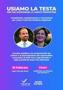 L’iniziativa è volta a promuovere l’incontro pubblico in programma a Chieri presso l’Auditorium Leo Chiosso venerdì 16 febbraio dal titolo “USIAMO LA TESTA PER FAR FUNZIONARE LA SANITÀ PIEMONTESE“ che vedrà la partecipazione di due parlamentari di Italia Viva: Luigi Marattin e Silvia Fregolent e quella di diversi professionisti del settore.
