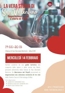 Mercoledì 14 febbraio 2024, in occasione della festa di San Valentino, si celebrerà l’amore e l’amicizia immergendosi in un’esperienza enologica senza pari. Nello Spazio San Giovanni, adiacente alla Chiesa di San Giovanni Battista, in Piazza Pertinace 4 ad Alba (CN), dalle ore 19.00 alle ore 20.15, si festeggerà il Santo protettore degli innamorati con un seminario esperienziale tra storie di Santi, patrimonio artistico e enologia. La serata sarà condotta da una guida turistica, che accompagnerà i partecipanti alla scoperta delle opere e delle storie dei Santi presenti all’interno della Chiesa di San Giovanni Battista.
