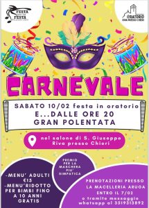 RIVA PRESSO CHIERI. Sabato 10 febbraio festa di Carnevale e Gran Polentata.