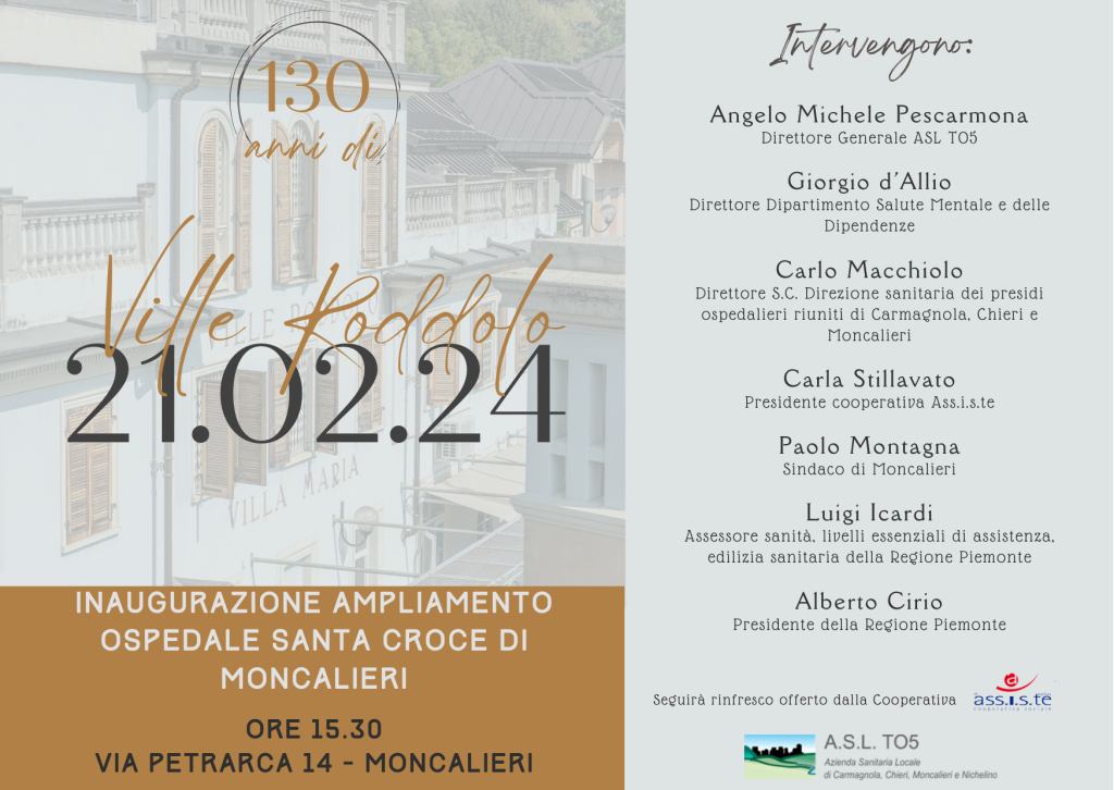 Mercoledì 21 febbraio inaugurazione dell’ampliamento dell’ospedale Santa Croce di Moncalieri nei nuovi locali di Ville Roddolo. Dopo i lavori di ristrutturazione,  dal 29 gennaio sono a disposizione dell’ASL TO5 nuovi spazi che permetteranno di avviare l’umanizzazione di alcuni reparti dell’edificio storico, di dedicare nuovi locali all’offerta ambulatoriale e di aumentare i posti letto a disposizione della struttura psichiatrica di diagnosi e cura. Sarà inoltre l’occasione per celebrare i 130 anni dalla costruzione del complesso di “Ville Roddolo”, struttura che continua, dopo più di un secolo, a essere dedicata alla cura dei soggetti più fragili.