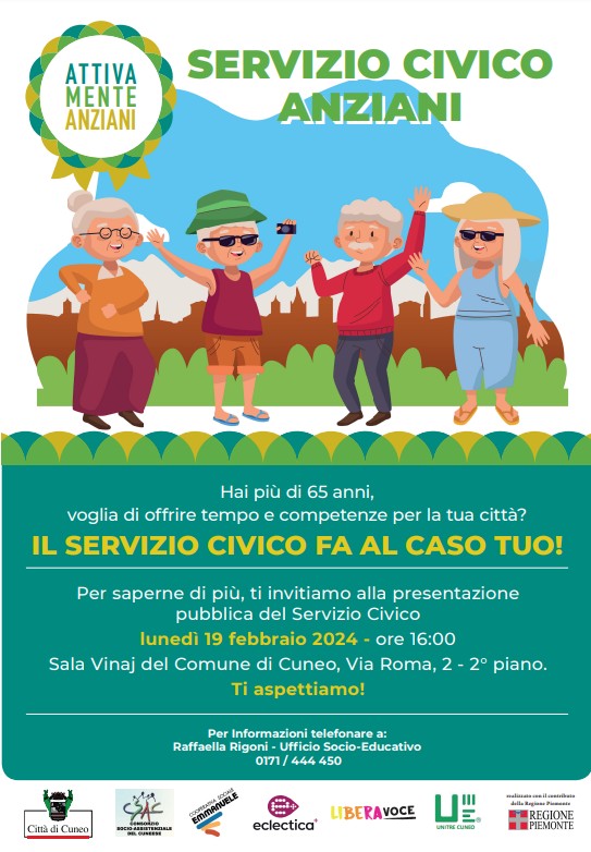 Una serie di attività rivolte agli over 65 che desiderano mettere una porzione del loro tempo, oltre a esperienze e saperi, a disposizione della città. I fini dell’iniziativa promossa dal Comune di Cuneo, ribattezzata “Servizio Civico”, sono: favorire la socializzazione, contrastare l’isolamento e rafforzare il senso di appartenenza alla comunità. La presentazione del progetto si terrà lunedì 19 Febbraio, alle 16, presso la Sala Vinaj (via Roma, 2 , secondo piano).