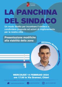 Dopo San Silvestro, Parco Levi, via della Gualderia, il giardino di via Monti/via Lombroso, la zona via Chiadò-Strada Roaschia, il cortile del Liceo Monti, il Municipio, il PA.T.CH-PArco Tessile Chierese e la Stazione/Piazza Don Bosco, il decimo appuntamento con la “panchina del Sindaco” è in programma mercoledì 14 febbraio, alle ore 17.00, in via Gramsci.